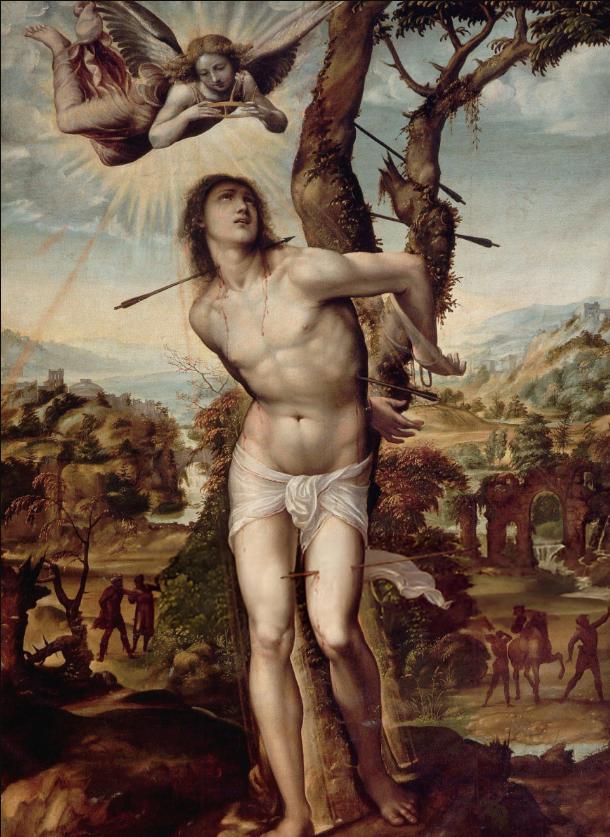 Джованні Антоніо Базза, відомий як Содома (Giovanni Antonio Bazzi, 1477–1549), у своїх творах демонструє особливий підхід до образу святого Себастьяна. Себастьян зображений з пронизаною стрілою шиєю, прив’язаним додерева. Над ним бачимо ангела, що тримає в руках корону мученика у золотому сіянні. Струнка фігура, характерний контрапост і блідість тіла створюють контраст із теплими, природними тонами фону – неба, гір та хмар.